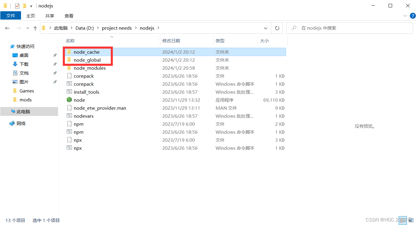 3.在 nodejs 安装目录下,创建 “node_global” 和 “node_cache” 两个文件夹