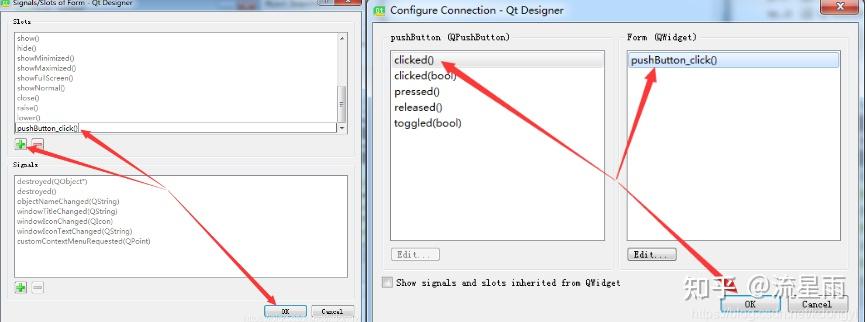 然后点击绿色“+”按钮,指定click事件的响应函数,名称随意,比如我这里命名为“pushButton_click()”