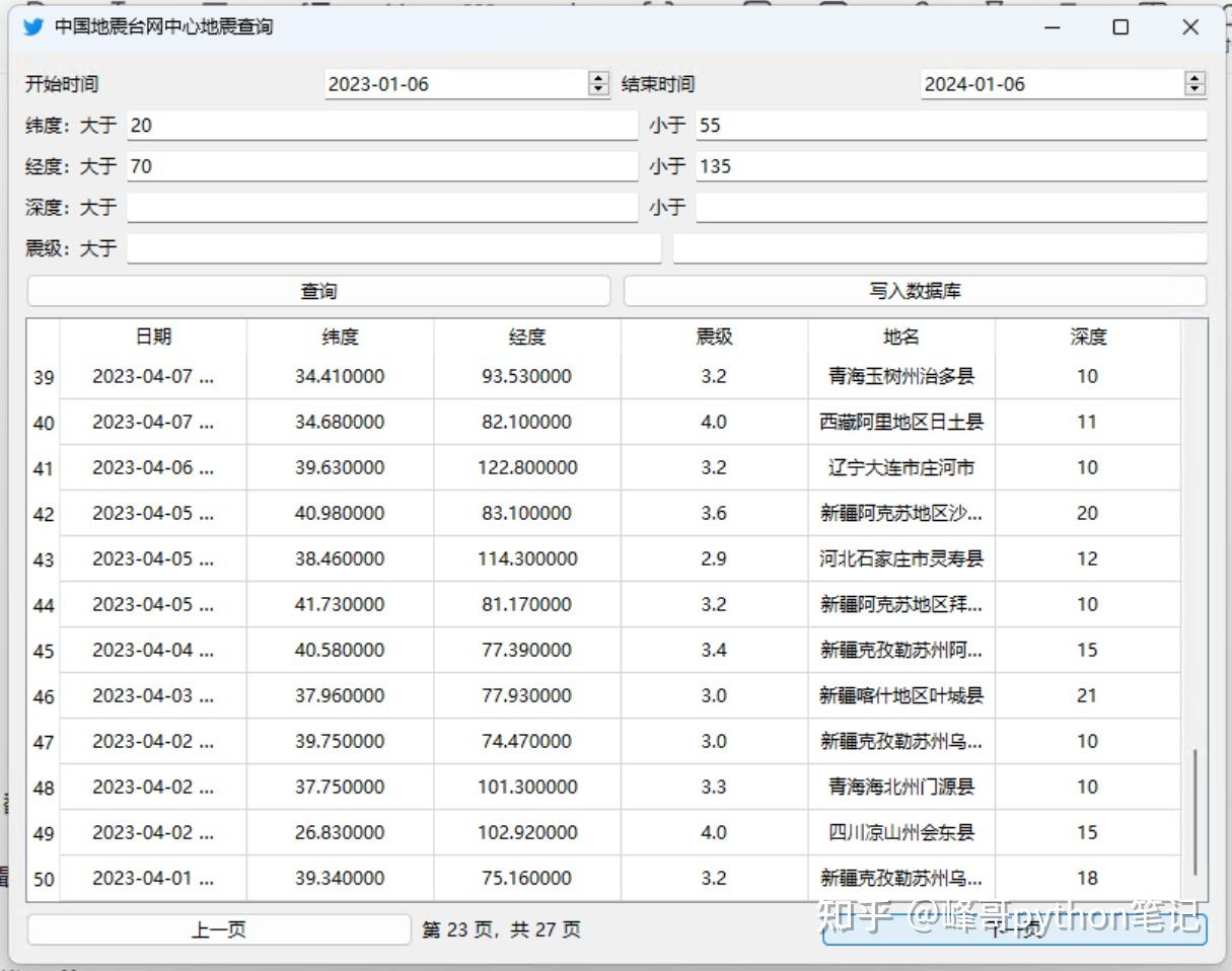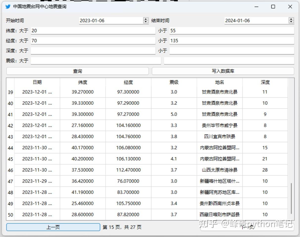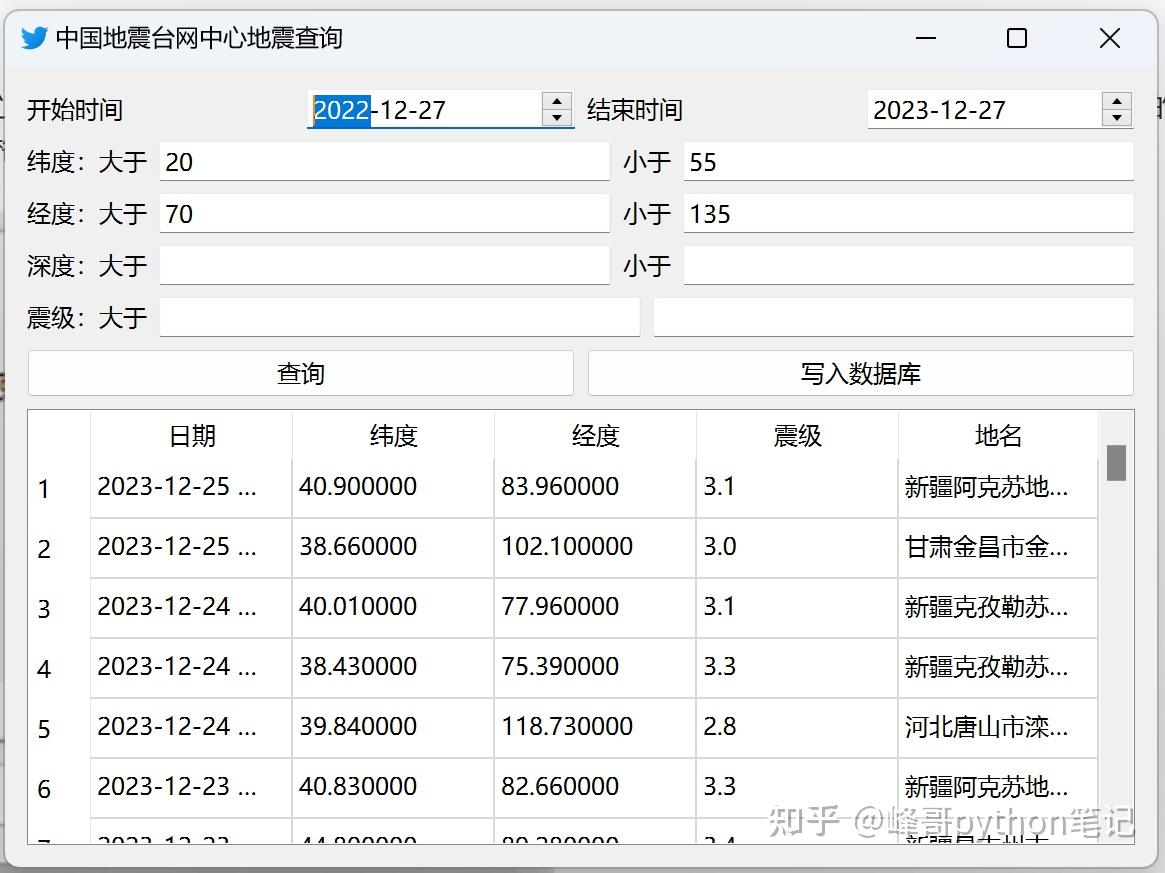 最早一版查询目录入库时没有深度,深度是后加上的,第一次写入库的深度为空。示例代码环境为 Python3.10.12、PyQt6 6.6.0,后台回复修改地震目录获取相关代码。