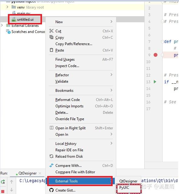 选中“untitled.ui”,在其上点击鼠标右键,到“External Tools”中点击“PyUIC”