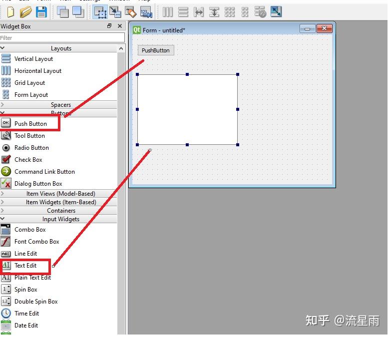 然后就会出现Qt Designer主界面,向Form中分别拖入一个“Push Button”和一个“Text Edit”,如下图: