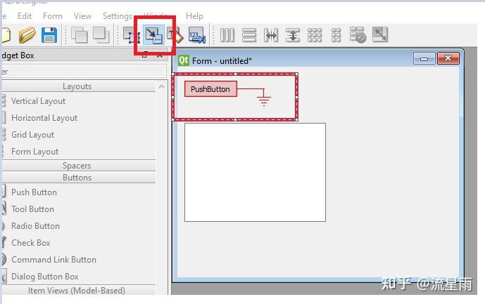 在工具栏点击 这个图标 ,然后光标移动到“PushButton”按钮上,鼠标左键 点击 “PushButton”按钮 不要松开,拖动光标 到 按钮旁边的任一位置后 再松开鼠标左键