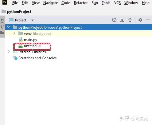 关闭QT Designer回到PyCharm,查看项目,可以看到只有刚才保存的untitled.ui文件在PyCharm是打不开的,我们需要将这个文件转成.py代码才能使用。