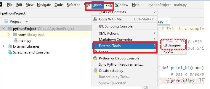 在PyCharm中创建一个项目,然后点击“Tools”–“External Tools”–“QtDesinger”打开QT Desinger,如下图:
