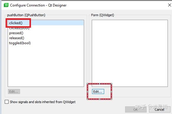 随后就出现了如下界面,在对话框左侧选中“clicked()”,右侧点击“Edit”