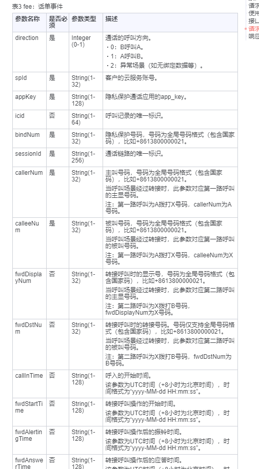 2.我最主要的用的功能就是这个终止呼叫接口,axbStopCall接口 这个接口的参数是sessionId ,但是你绑定AXB的时候华为没有给你返,那这个sessionId 怎么拿呢。你需要出一个接口 来接受消息回执(这个是阿里中的说法,华为叫话单通知接口,名字比较拗口,就暂用消息回执)。这个消息回执中需要接受华为传给你的参数 关于这个电话的详细参数,这里面有sessionId,你存到数据库中怎么来取呢 根据绑定Id subscriptionId 这个字段来取 接下来就很简单了