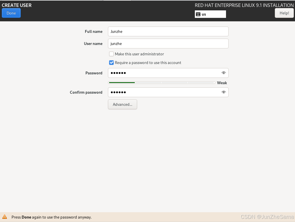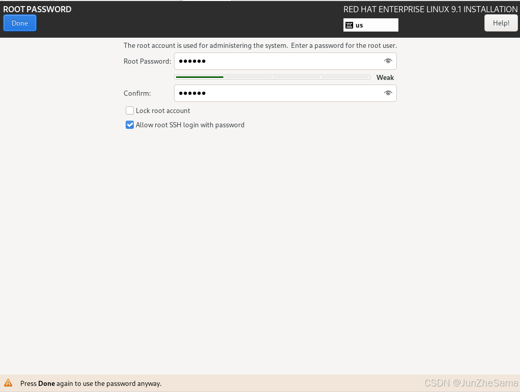 此处设置root密码,一定要勾选SSH登陆(密码简单的话需要点两次确认)