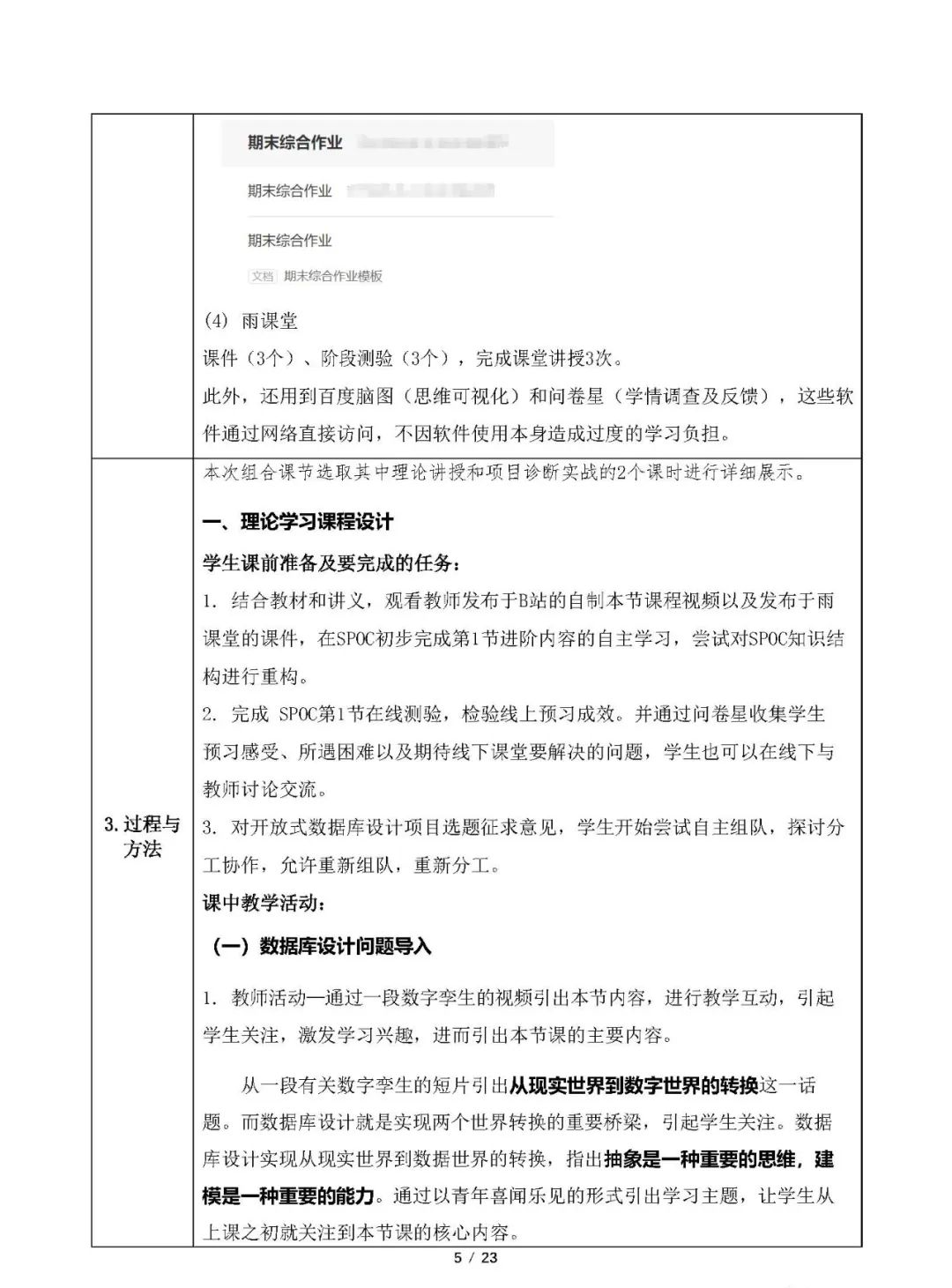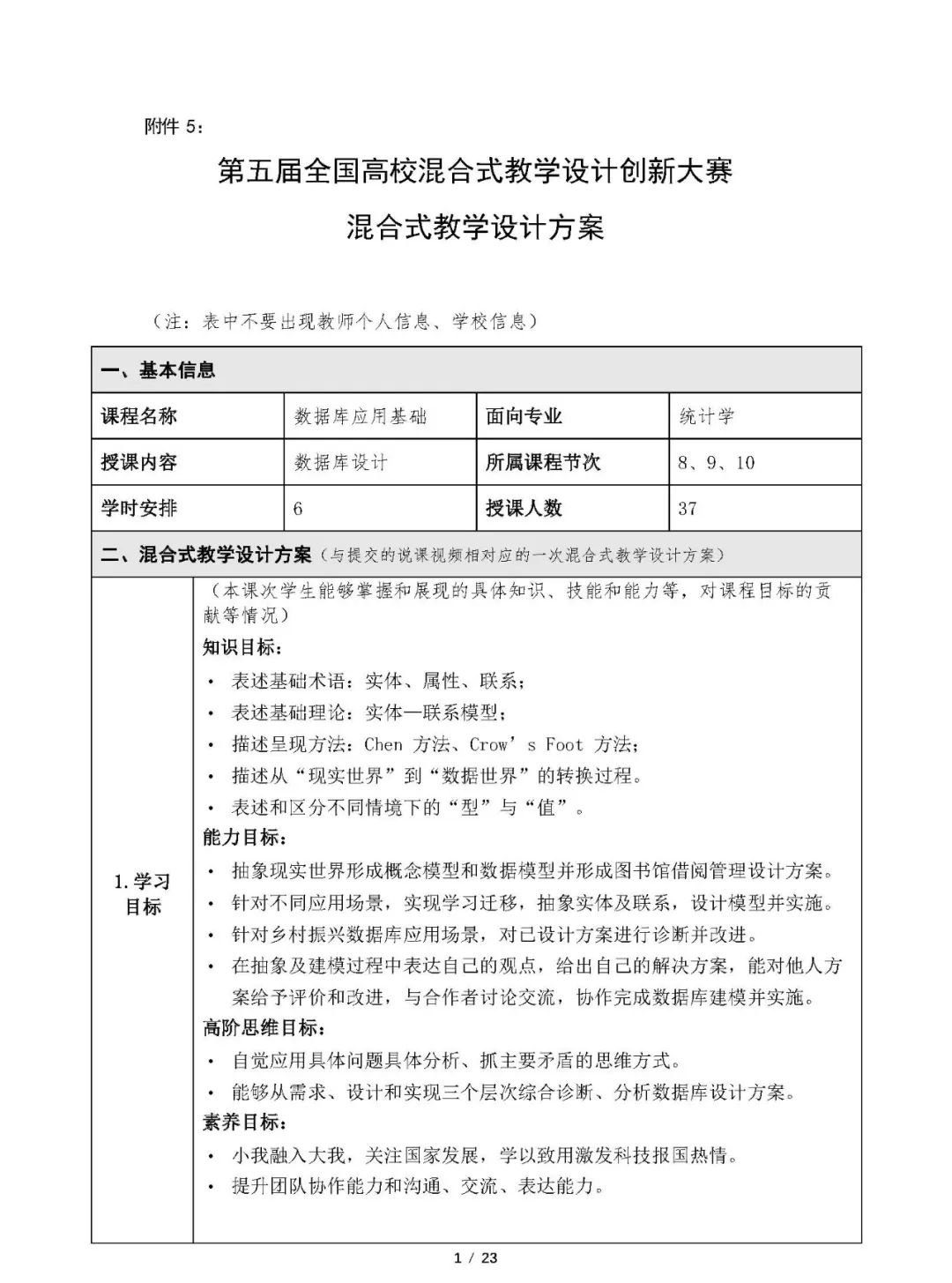 编者按:北方工业大学王若宾的“数据库应用基础”获得第五届全国高校混合式教学设计创新大赛一等奖等。现将王老师混合式教学设计方案相关资料分享,供各位老师参考、学习。