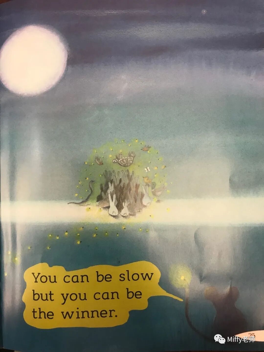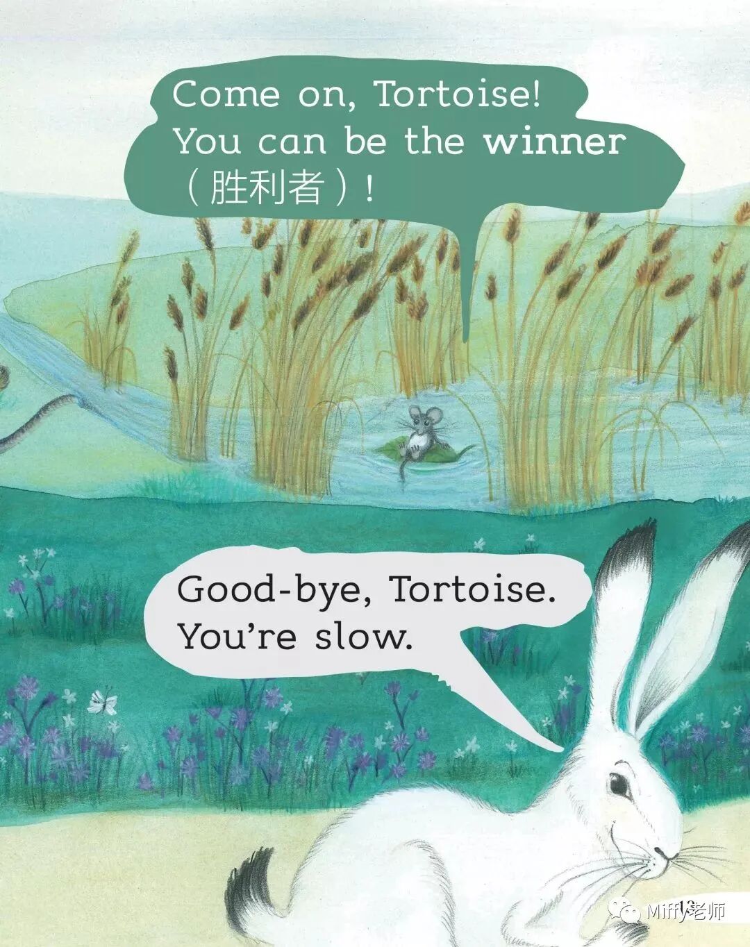 The mouse says:“Come on(加油), Tortoise! You can be the winner!”