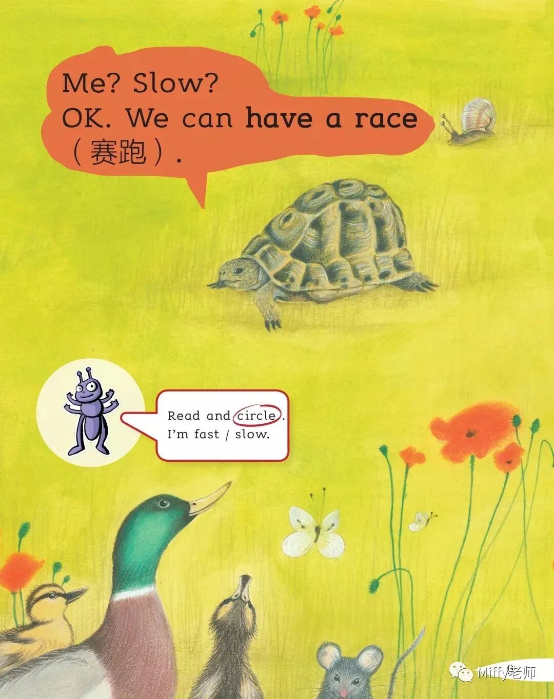 “看那只乌龟,他跑不动,他跑得很慢。”
