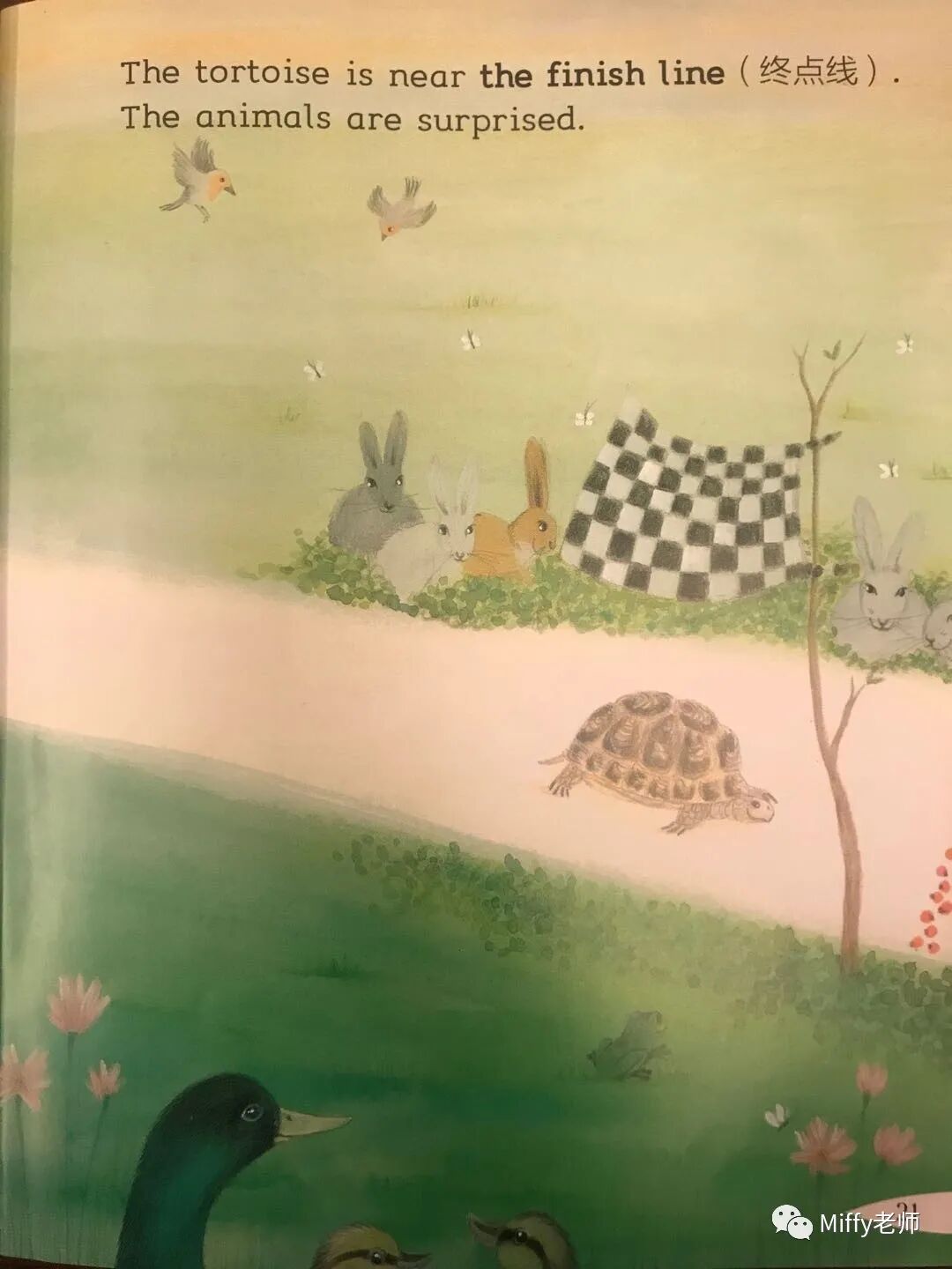 “Where’s the tortoise? Oh, no! He’s near(接近)the finish line. ”