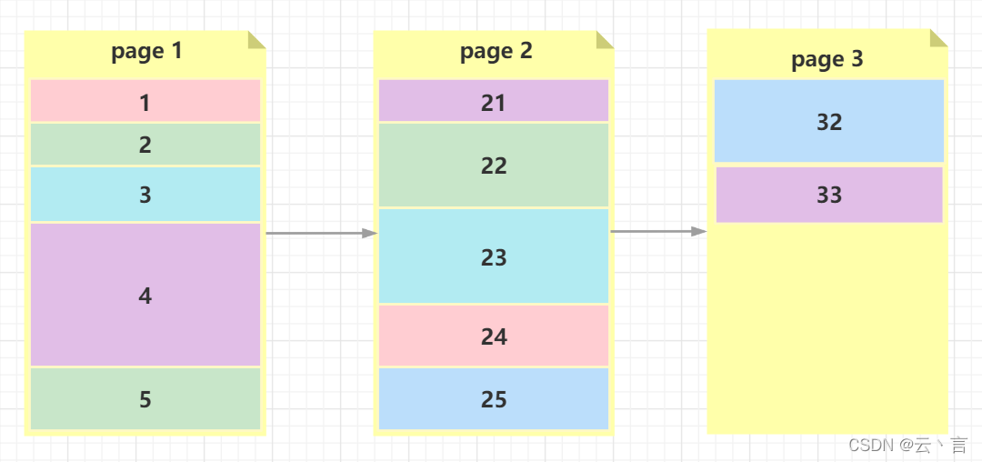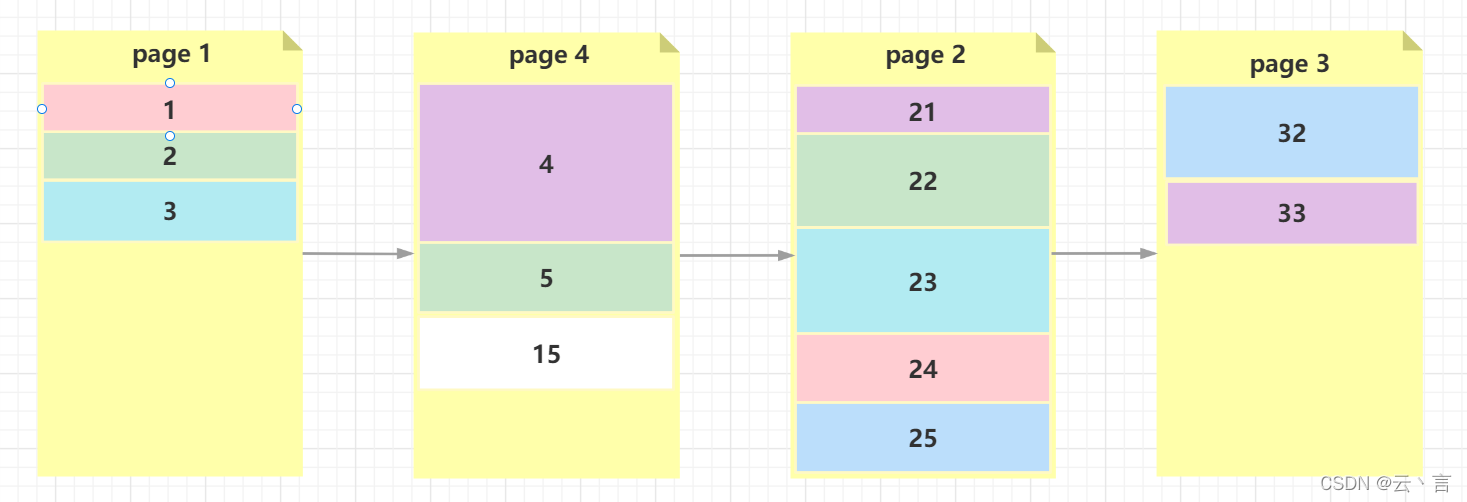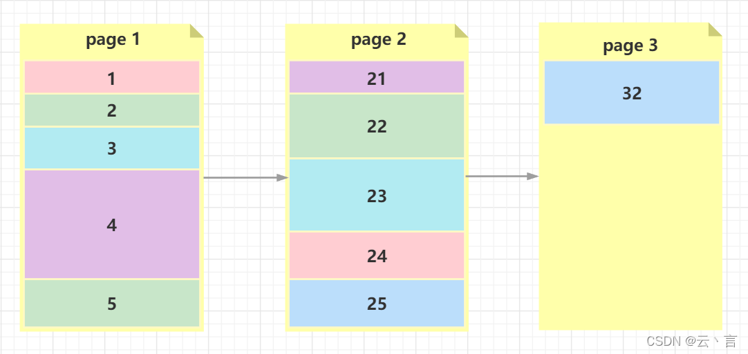 如下图:共有三个“页”(page1、page2、page3),其中page1存储了关键字在的数据,page2存储了关键字在的数据,page3只存储了一个关键字为32的数据。
