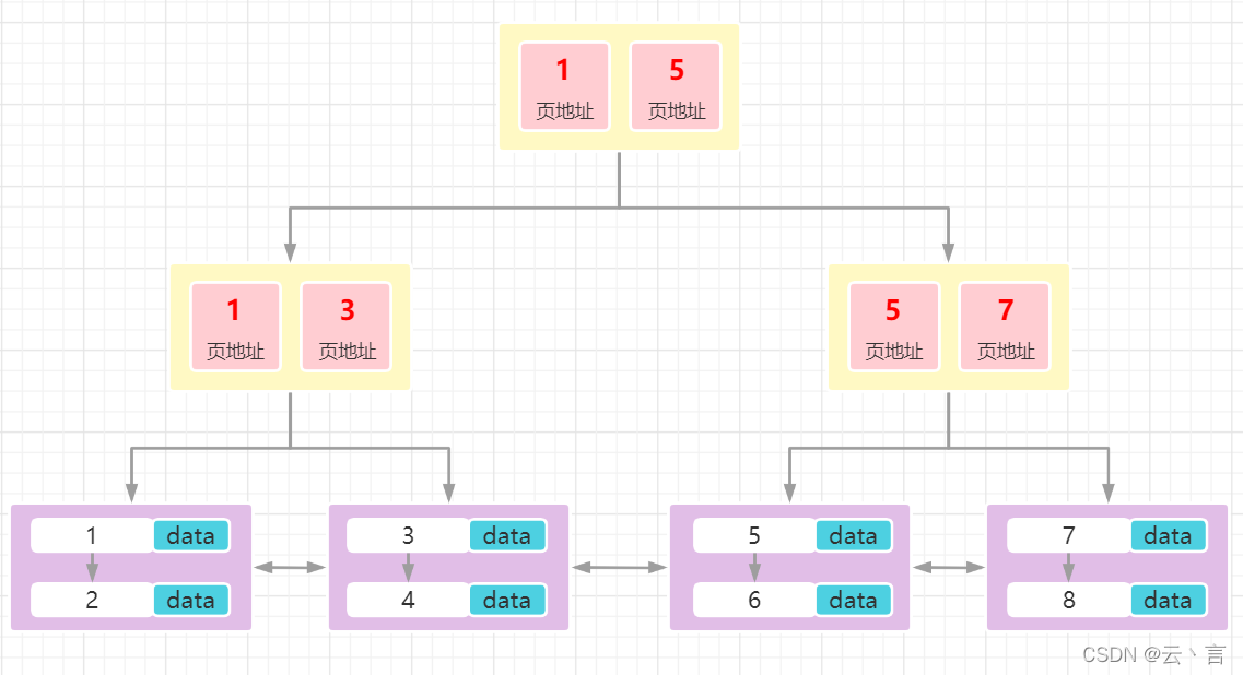 需要注意的是: 为了方便范围查询的操作,InnoDB的B+树结构叶子节点之间是通过进行连接的。详情可到MySQL官方文档查看:https://dev.mysql.com/doc/internals/en/innodb-fil-header.html
