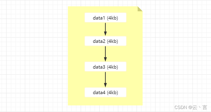 如下图: InnoDB其中一页数据包含四条信息分别为:data1、data2、data3、data4,且每条数据的所占空间大小都为 。在不引入页的思想时,查询数据data1后,此时执行一次IO操作;如果我还想继续查询数据data2,需要再执行一次IO操作。总共执行了两次IO操作,但当我们引入页的思想后,查询数据data1时,将会查询出整一页的内容(data1、data2、data3、data4),接着查询data2时,由于内存中已经存在data2的数据了,因此无需再进行IO操作,在内存中获取即可。