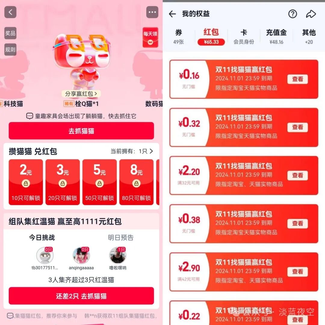 淘宝拆包是什么意思(淘宝拆包员具体做什么的)小伙伴注意啦 请添加微信群 及时活动信息请添加微信群 注意禁言群请不要发消息及广告等 长按扫码加微信回复 进群 长按二维码进入禁言群 淘宝抓猫猫红包活动抽多个红包 活动介绍 淘宝举办的双 11 抓猫猫赢红包活动 进去去指定页面找猫 可以抽奖多次 有机会中到多个随机金额无门槛红包 还可以跟 3 个好友一起组队抓猫抽最高 1111 元红包 右上角图标集齐指定猫第二天还可以得翻倍红包