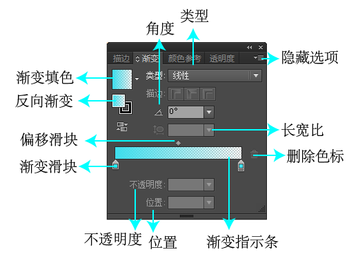 点击渐变按钮则打开渐变面板。渐变分为线性渐变和径向渐变。通过拖动「渐变滑块」,可以改变渐变颜色位置。拖动「偏移滑块」可以设置两个渐变色之间的混合效果。通过修改「角度」可以改变渐变的方向。