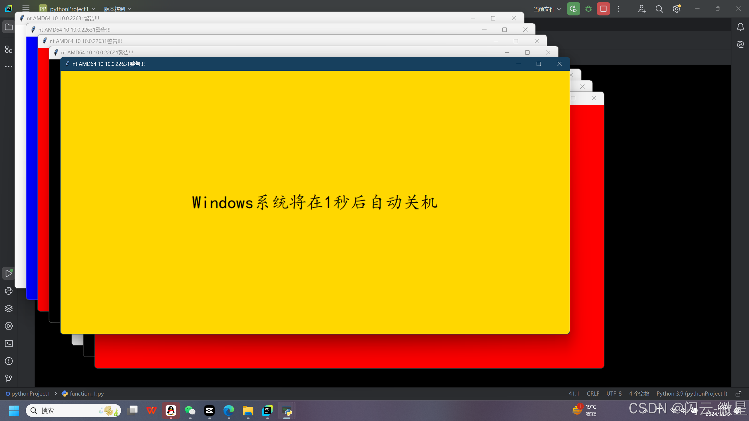 主窗口就是我们的弹窗。这里我们制定一个函数windows(),用来打开弹窗,接下来就需要利用上面所给的自定义count_down()函数对弹窗标题进行实时内容更新。我们利用while函数对倒计时迭代器的返回内容进行一对一匹配(即不让弹窗颜色始终保持原状)。接着就是tkinter弹窗标题进行设计,我们使用os模块的name属性来获取操作系统的名称,使用platform模块来获取与系统相关的更详细的信息:platform.system() -输出操作系统名称,如 ‘Linux’ 或 ‘Windows’;platform.release() -输出操作系统版本号;platform.version() -输出操作系统版本信息;platform.machine() -输出计算机类型……接下来是窗口大小的设计,本次编程我采用的是1160x600(大家可自行设置)。number为0~9的随机数(包含0,9),它将提供给我们列表s中颜色的编号(即赋给bg)。然后就是弹窗内容了,我们将倒计时迭代器所匹配得到的内容加入其中,设置文字类型为楷体,文字大小为30,长宽与上面相同。利用pack()函数进行固定,mainloop()函数执行。如下所示:
