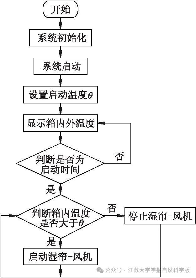 由图3可知,智能温控系统开始工作后,所有设备进行初始化.初始化完毕后,启动读取系统时间模块及温度检测模块,开始采集垃圾箱内部温度及室外温度.系统判断当前时间与设定的开机时间是否一致,若系统到达设定开机时间,则对垃圾箱内部平均温度进行判断,若当前检测温度超过设定温度上限θ,则开启湿帘水泵、负压风机,进行强制通风降温调节.