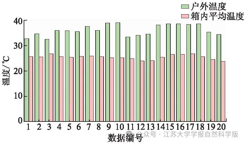 温湿度及风速检测选择接触式仪器,保留相对湿度条件差小于10%、风速差小于0.5 m/s的检测数据,筛选出20组数据,如图5所示.垃圾箱内平均温度保持在(25±2)℃,达到垃圾箱内部降温要求.