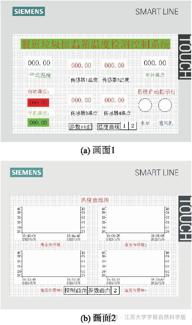 4) 上位机.为了实现数据输出及可视化,选择西门子触摸屏与PLC控制器连接,将温度监测数据及变化曲线显示到触摸屏上.在实际应用过程中,不同社区住宅的垃圾投放要求及处理时间不尽相同,因此可通过上位机控制降温装置的执行机构.