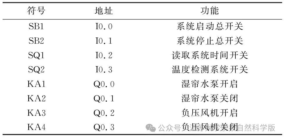 根据垃圾箱智能温控系统的功能需求和硬件选型需要,需要监控垃圾箱内外的温度及变化曲线;另外需要根据社区住宅规定的垃圾投放时间,调节系统启动时间,确保垃圾箱的封闭状态,并根据温度变化对湿帘-风机降温装置进行控制.因此,PLC控制器的输入点包括系统启动和停止按钮、读取系统时间开关、温度检测模块监测开关;输出点包括湿帘水泵、负压风机的开关等.具体硬件接线如表2所示.