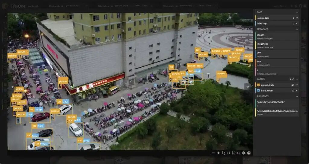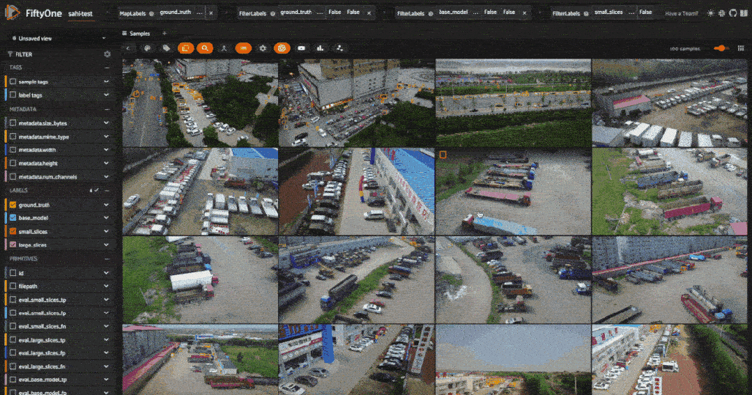 kwargs = {“overlap_height_ratio”: 0.2, “overlap_width_ratio”: 0.2}for sample in dataset.iter_samples(progress=True, autosave=True):predict_with_slicing(sample, label_field=“small_slices”, slice_height=320, slice_width=320, kwargs)predict_with_slicing(sample, label_field=“large_slices”, slice_height=480, slice_width=480, kwargs)