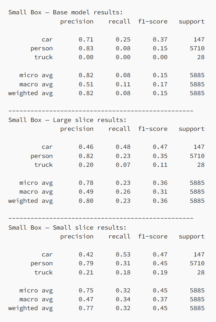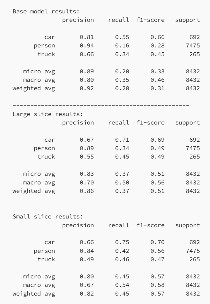 讯享网print(“Base model results:”)base_results.print_report()print(”-” * 50)print(“Large slice results:”)large_slice_results.print_report()print(”-” * 50)print(“Small slice results:”)small_slice_results.print_report()
