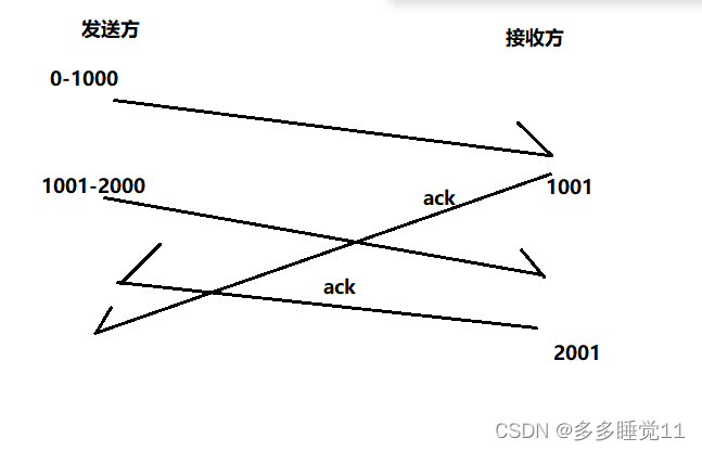 接收方会记录收到的数据报的字节数据的编号,返回ack时,以未收到的最小的编号作为确认序号。比如:传输0-1000,1001-2000,2001-3000,3001-4000,当0-1000这个编号的数据报未被传输到,1001-2000,2001-3000数据报先传送到,返回的ack的确认序号都是0。这里要再次重申一下ack确认序号的代表两个意思: