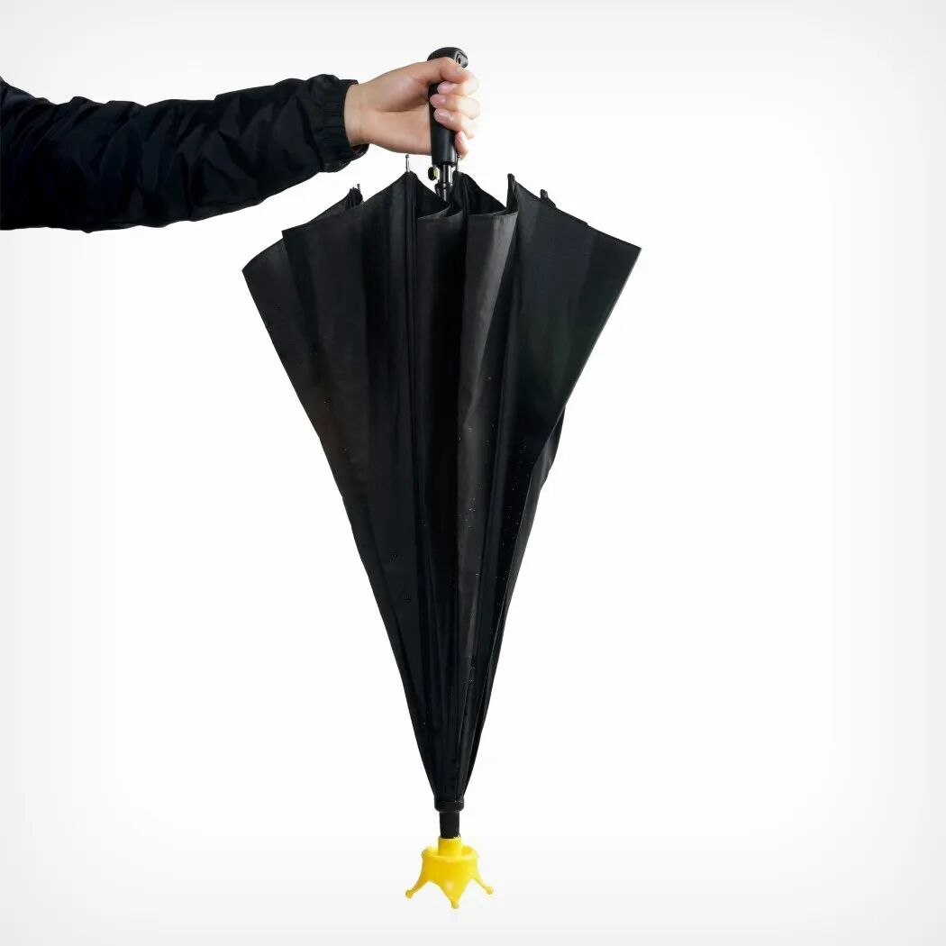 雨伞的顶部形状看起来像水花,颜色是黄色,像一个迷你皇冠,支撑伞解决了两个相当烦人的问题:稳定和水滴在地上形成小水洼。