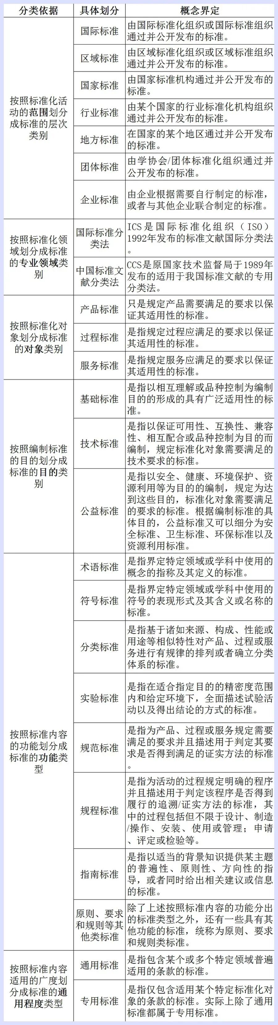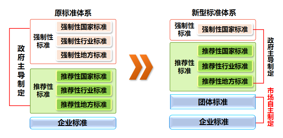 《中华人民共和国标准化法》将标准分为国家标准、行业标准、地方标准和团体标准、企业标准。国家标准分为强制性国家标准、推荐性国家标准,行业标准、地方标准是推荐性标准,团体标准、企业标准是市场自主制定的标准。强制性国家标准必须执行,推荐性标准鼓励采用。