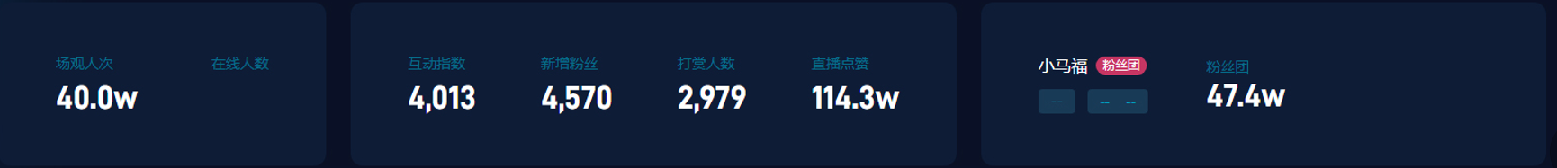 【介绍】从左往右分别是:场观人次、在线人数、直播时间和时长、直播间互动数据、粉丝团信息