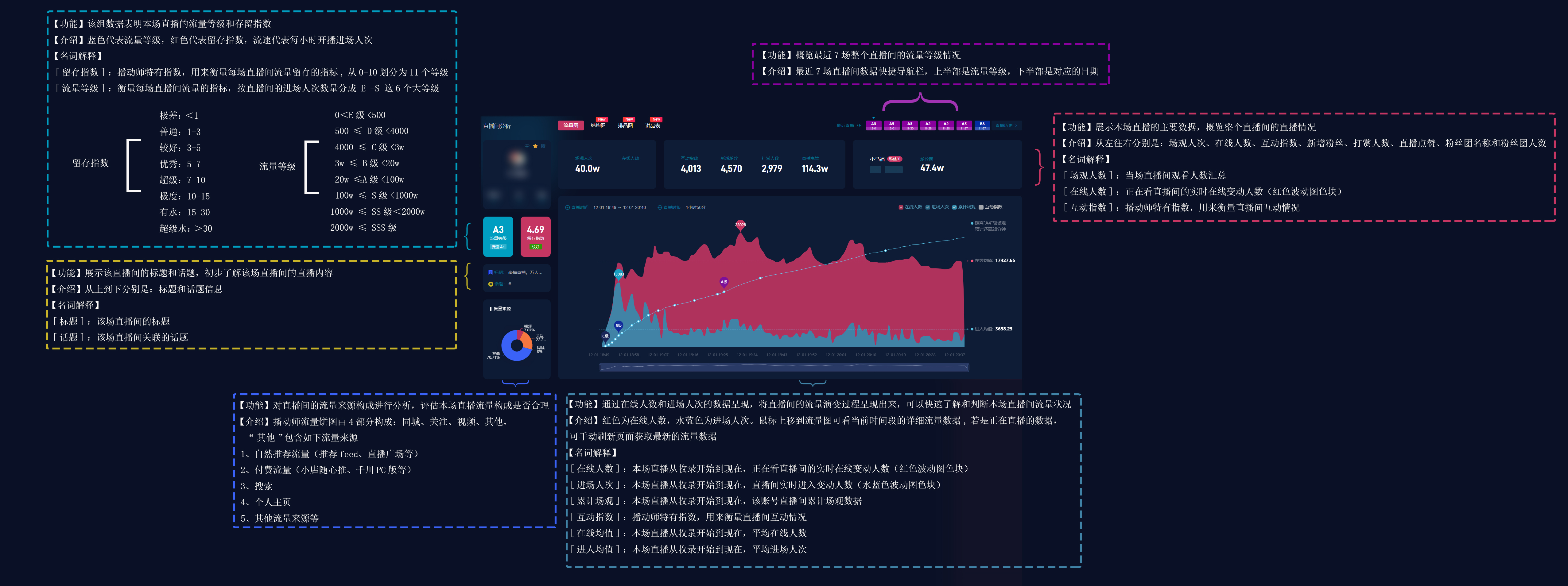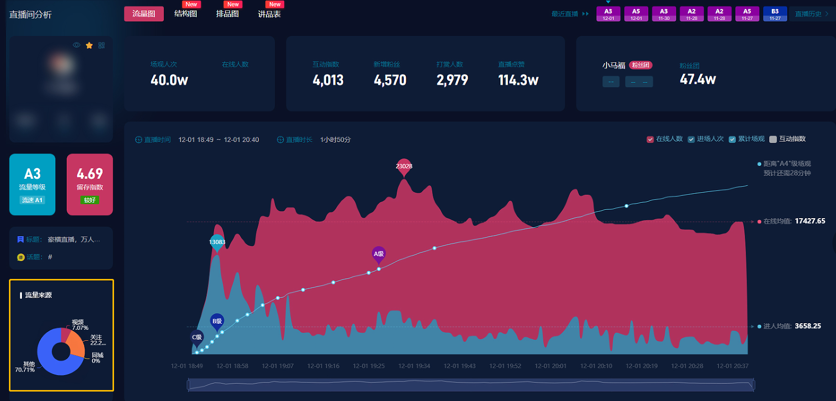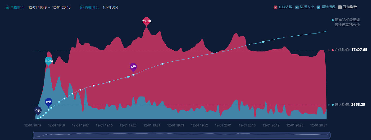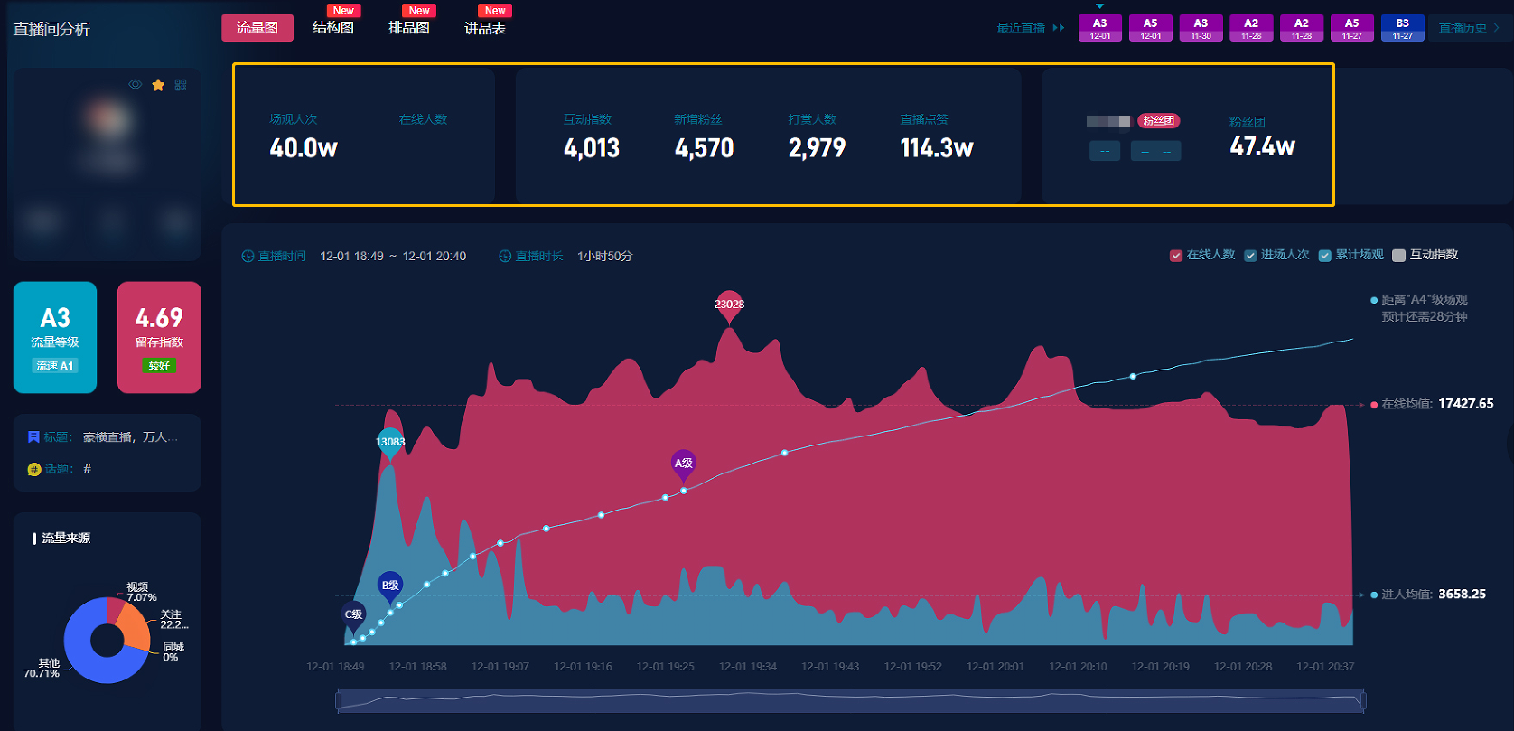 【功能】该组数据表明本场直播的流量等级和存留指数