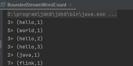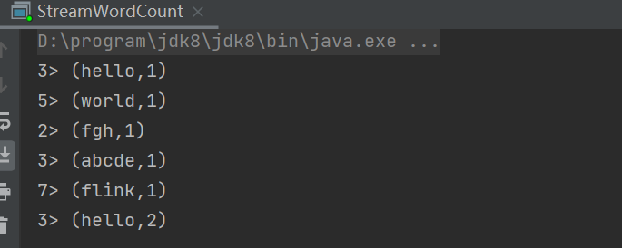 看到这里大家可能又会有新的疑惑:我们读取文件,第一行应该是“hello flink”,怎么这里输出的第一个单词是“world”呢?每个输出的结果二元组,前面都有一个数字,这又是什么呢?
