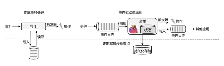不难想到,如果我们对于事件流的处理非常简单,例如收到一条请求就返回一个“收到”,那就可以省去数据库的查询和更新了。但是这样的处理是没什么实际意义的。在现实的应用中,往往需要还其他一些额外数据。我们可以把需要的额外数据保存成一个“状态”,然后针对这条数据进行处理,并且更新状态。在传统架构中,这个状态就是保存在数据库里的。这就是所谓的“有状态的流处理”。