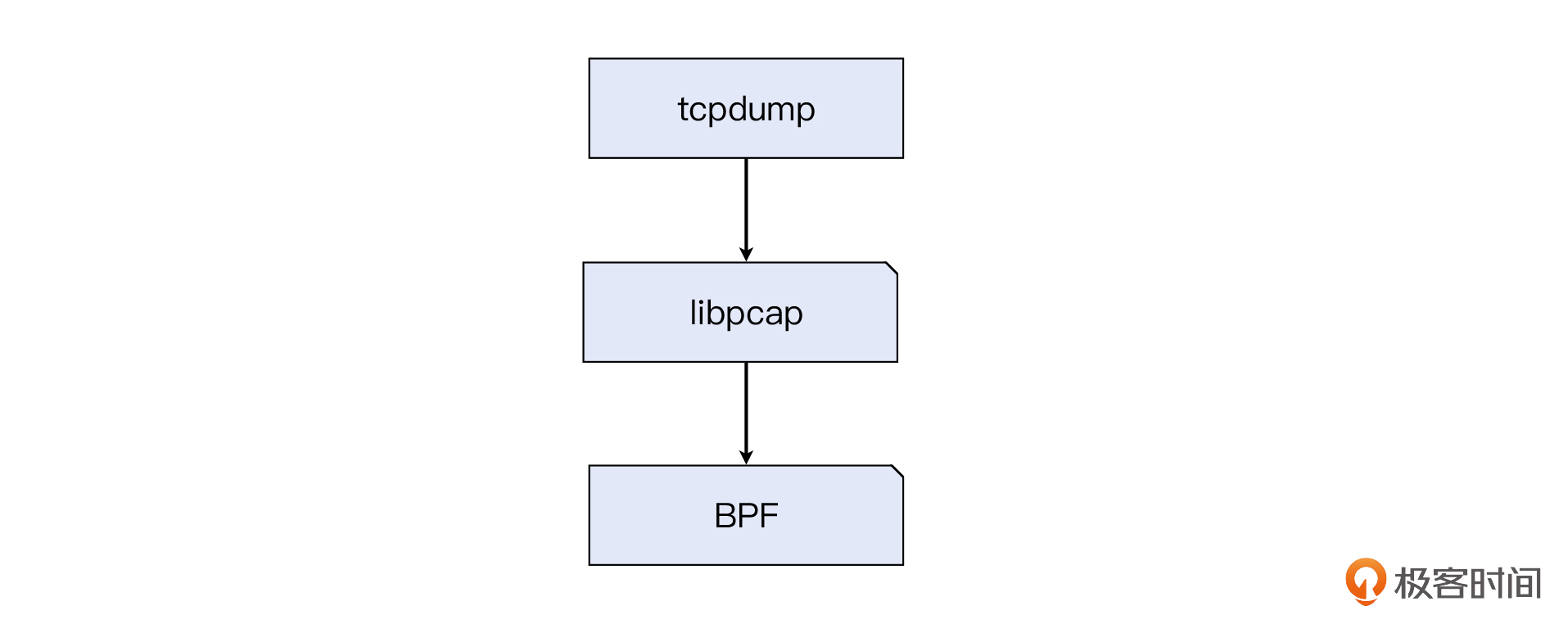 那么到目前为止,我们应该就能明白tcpdump是怎么工作的了:tcpdump调用了libpcap接口,后者调用BPF实现了报文过滤和抓取。我们来看一下示意图: