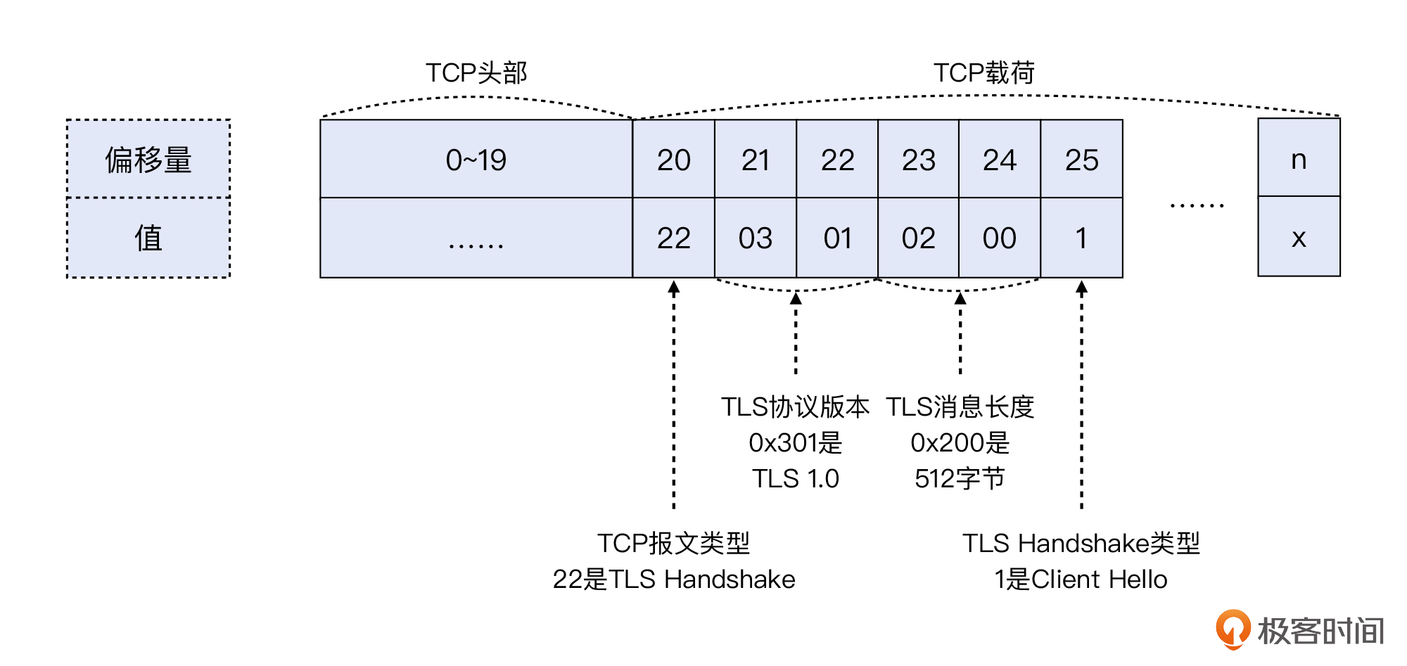 其实,BPF本身是基于偏移量来做报文解析的,所以我们也可以在tcpdump中使用这种偏移量技术,实现我们的需求。下面这个命令,就可以抓取到TLS握手阶段的Client Hello报文: