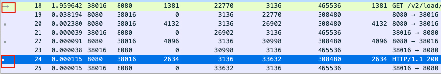 我们只要选中请求报文,Wireshark就会自动帮我们匹配到对应的响应报文,反过来也一样。从图上看,应用层请求(这里是HTTP请求)是一个向右的箭头,表示数据是进来的方向;应用层响应是一个向左的箭头,表示数据是出去的方向。