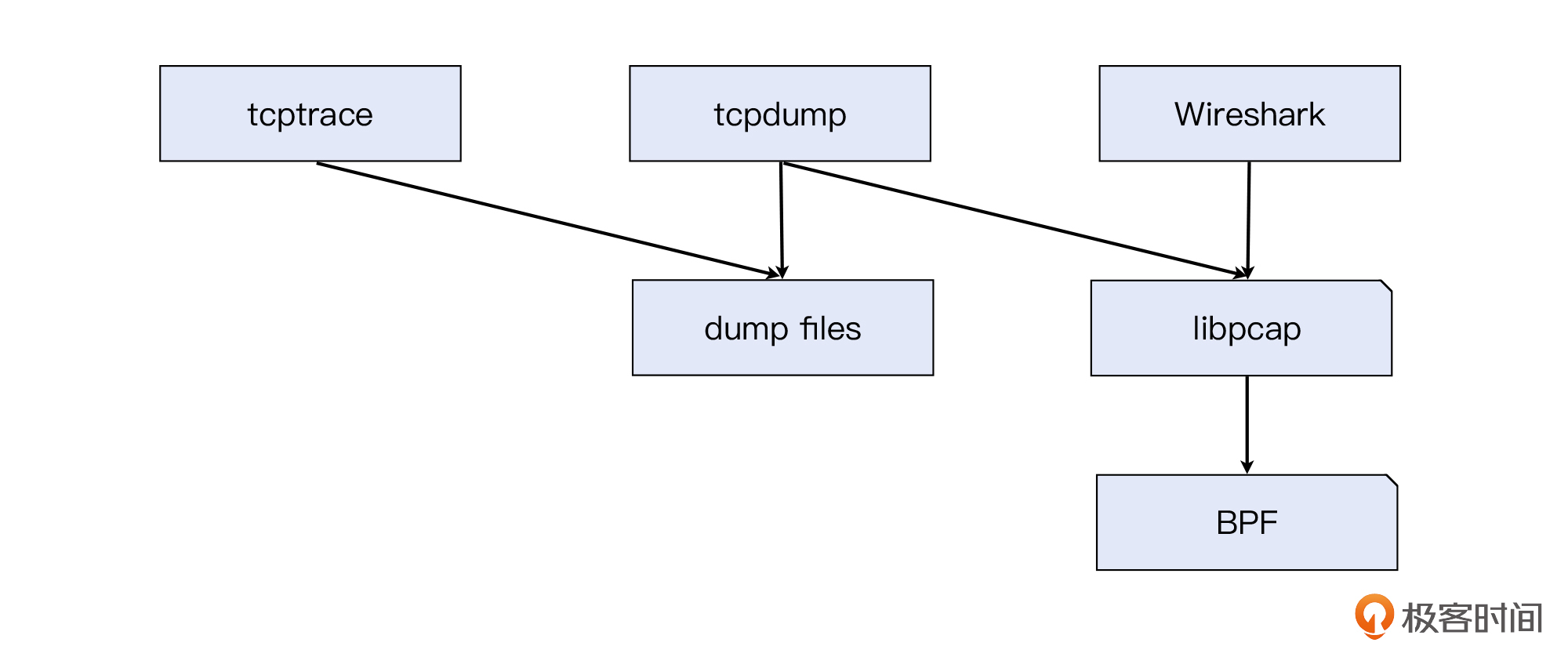 BPF实现了抓包虚拟机,但它是如何被用户空间程序使用的呢?于是,libpcap出现了,它提供了API给用户空间程序(包括tcpdump、Wireshark等),使得后者能方便地调用BPF实现抓包过滤等功能。也就是说,libpcap是BPF的一层API封装。