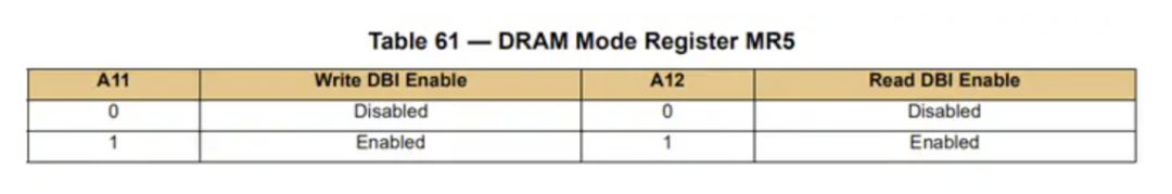 通过 MR5 使能或者关闭读写 DBI 功能,读写 DBI 功能分别由 1 比特控制。