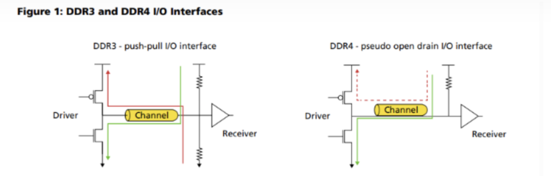 在 POD 中,接收器将信号终结(terminated)到 VDD 的高电平,而不是像前代一样终结到一半的 VDD 电压。在低电平状态下,SSTL 和 POD 都有电流消耗,如下图中的绿线所示。实际上,POD 可能会消耗略高的电流,因为其终结电压是 VDD 电压,而SSTL的终结电压仅为 VDD 电压的一半。这在一定程度上被 DDR4 稍低的电源电压所抵消,DDR4 VDD 电压为 1.2V,比 DDR3 的 1.5V 显著降低。