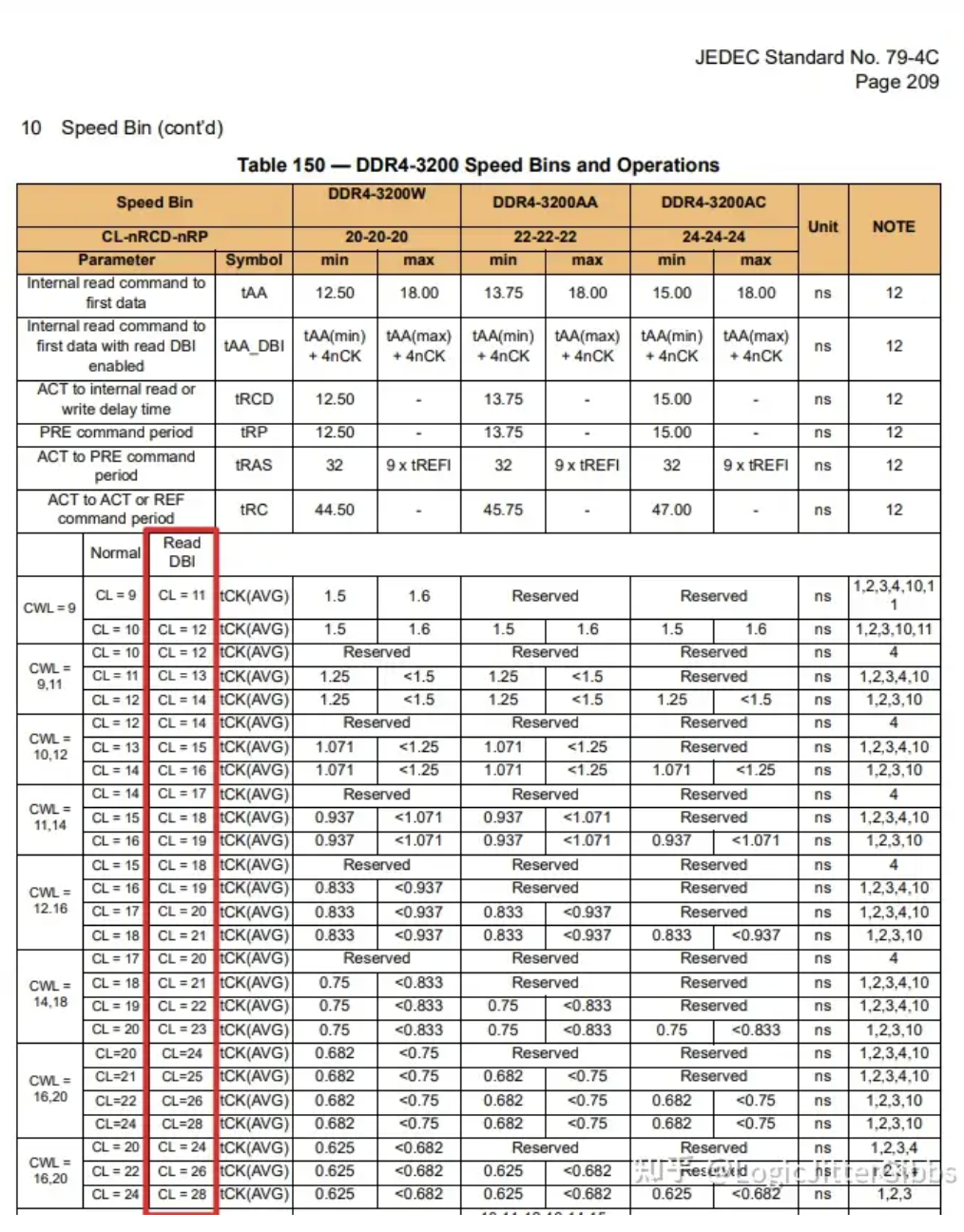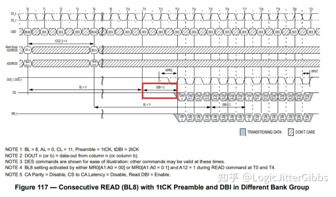 当 read DBI 使能时,读数据返回会有额外 tDBI 个时钟周期延迟。Spec 中在规定 CL 的时候,额外规定了 read DBI 使能时的 CL,比正常 CL 数值大 2 - 4,所以笔者认为这里额外的 tDBI 是 2 - 4 个周期。