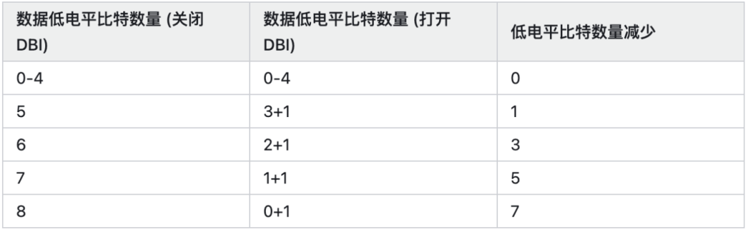 在一项功耗敏感的应用,可以使用 DBI 功能来节省 DRAM IO 动态功耗,节约的功耗大约在 50mW 量级 (DRAM+SoC/PHY),具体节约的功耗大小取决于数据比特跳转的频率。但 DBI 的开销主要是写方向不能使用 DM 引脚,读方向会增加 2-4 个周期延迟。