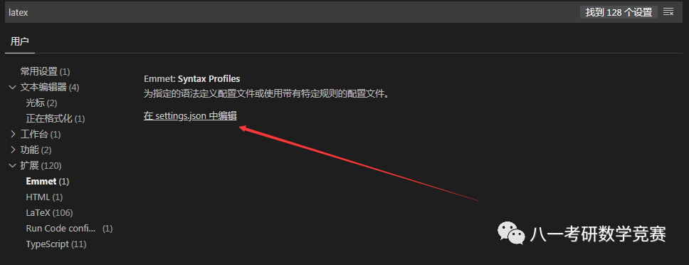 第二步:在软件左下角找到设置,搜索 latex,并点击在 settings.json中编辑,如下图