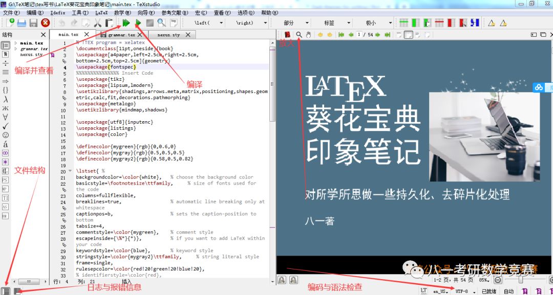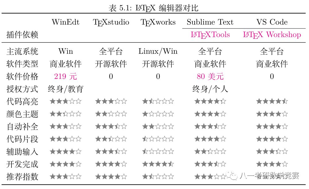 继上一篇LaTeX专栏001|入门篇-谈安装与排版心得,主要侧重于讲解安装和认识LaTeX,以及它的结构组成,包括其常用宏包的叙述,上篇写的内容已经足够多了,这次八一再续写入门篇之编辑器选择配置:关于TeX 编辑器主要包括TeXStudio、 WinEdt、TeX Shop、TeX pad(Mac版)、VsCode与 Sublime,但我主要讲下TeXStudio与VsCode的配置和使用,这里借用很早之前东升学长对 LaTeX 编辑器的调查,其实我们不然发现到TeXStudio与VsCode的推荐指数是前列,不过我个人比较喜欢用专业软件去做专业的事,其它如TeX Shop、TeX pad等我不讲了(非苹果用户).