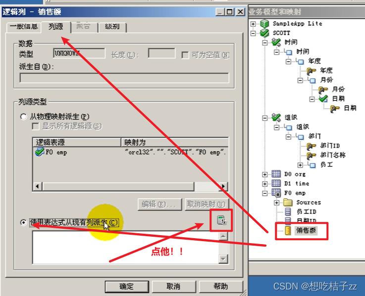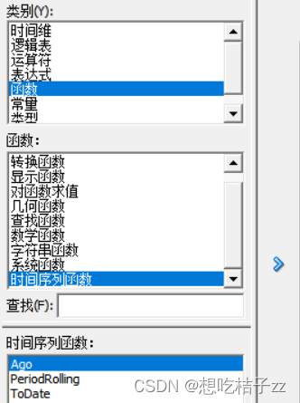 之所以需要选择一个字段作为序时关键字,是因为要在后面的计算字段(如销售额)能使用时间函数。双击'F0 emp'中的‘销售额’字段,选择‘列源’中‘使用表达式从现有列派生’右边的图标。选择‘函数’ => '时间序列函数' 有3个,依次举例