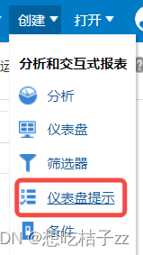 首先需要建立需要的报表(此处的报表不需要进行对选项的设置,比如不需要提前设置公司编码为'008'之类),其次建立仪表盘,将需要的报表拖到仪表盘中【注意每一步都需要保存,不然跳转到别的界面将去除之前的操作!】。之后选择右上角创建'仪表盘提示',如下图: