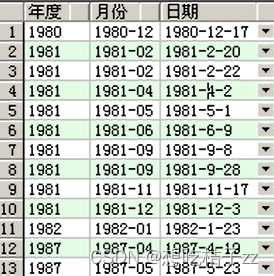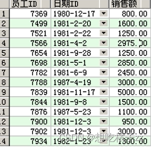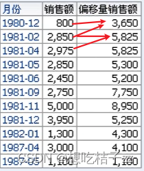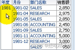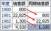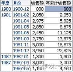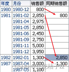 在 OAS 可以得到如下数据,虽然1987年的同期销售额应该为1986年,但如果没有1986年的数据,那就会往上找上一行的数据(1982年),月份也是相同情况: