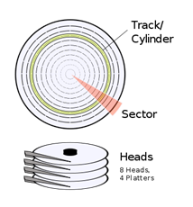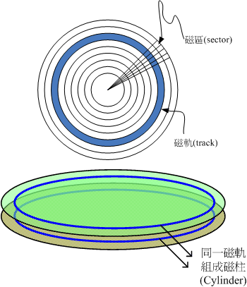 然後将磁碟旋转﹐磁头不移动的在表面相对所画出来的一圈﹐可以说是一个磁轨(Track)。那麽从圆心向外以一定距离进行量度﹐将所有表面上的相同圆周的磁轨从上到下叠起来﹐抽象地看就是一个磁柱(Cylinder)了。