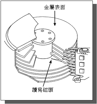 如果将硬碟打开(但千万别在您自己的硬碟上这样做﹗因为硬碟是密封的﹐一经打开就差不多成为废物了)﹐您会发现里面有一堆以圆心为轴的金属碟﹐它们已经被磁化的了。所有的资料都是记录在这些光滑的金属碟表面之上。每个金属磁片通常都有两面﹐每一面都有其各自的读写磁头(Head)一个。如图﹕