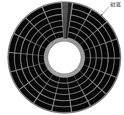 然後﹐也是由圆心开始﹐在同一表面上分别画出无数条半径﹐然後每两条半径所分割的磁轨﹐我们称为磁区(Sector)。每一磁区通常会可携带512byte(0.5KB)的资料。请看图例﹕